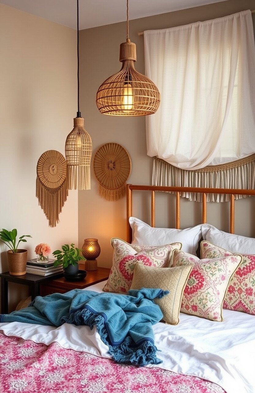 Lighting is key in creating a Boho chic vibe. Unique light fixtures can serve as functional art pieces in your bedroom.