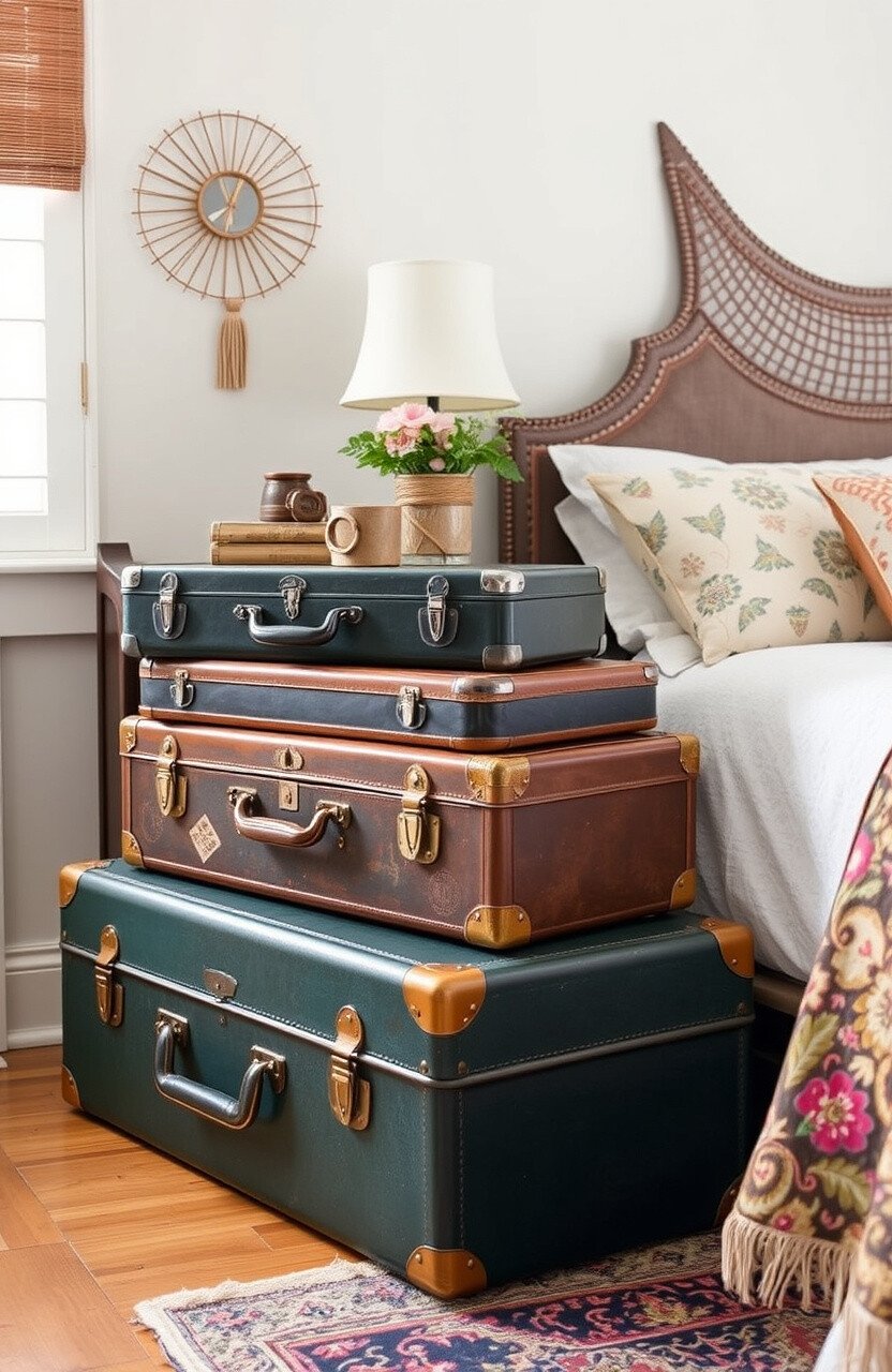 Vintage suitcases offer stylish storage solutions and add a nostalgic touch. They can be stacked as a unique bedside table or placed at the foot of your bed.