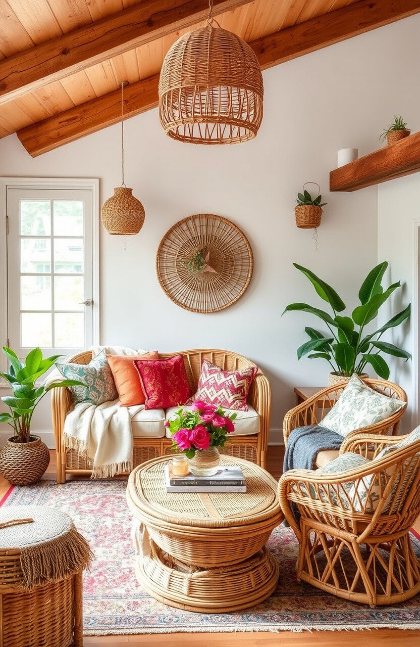 Wicker and rattan furniture add a natural, airy feel to your living room. Their light, woven textures complement the boho style beautifully. Consider a rattan chair or a wicker coffee table for a unique touch.