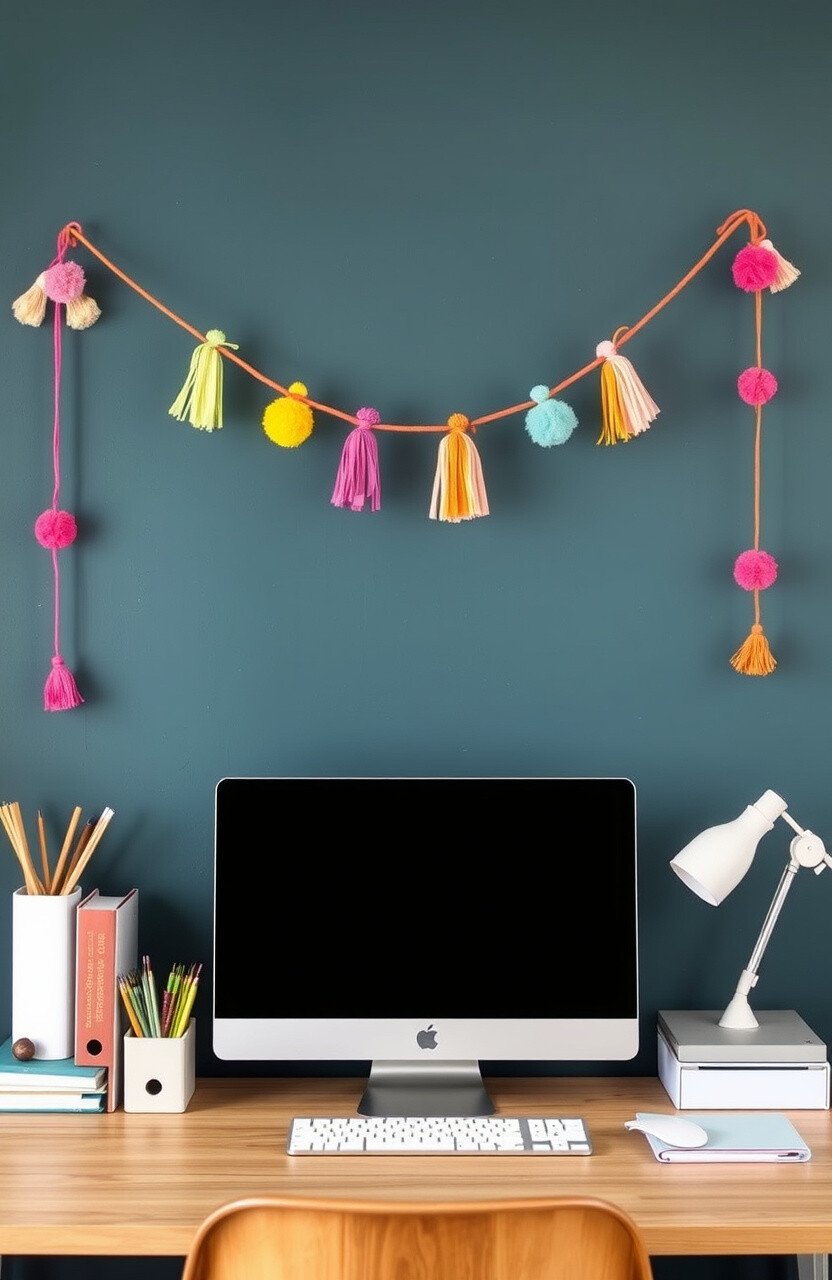 Hang a rainbow garland above your desk for a festive touch. These garlands are often made from fabric or paper, adding texture and color.