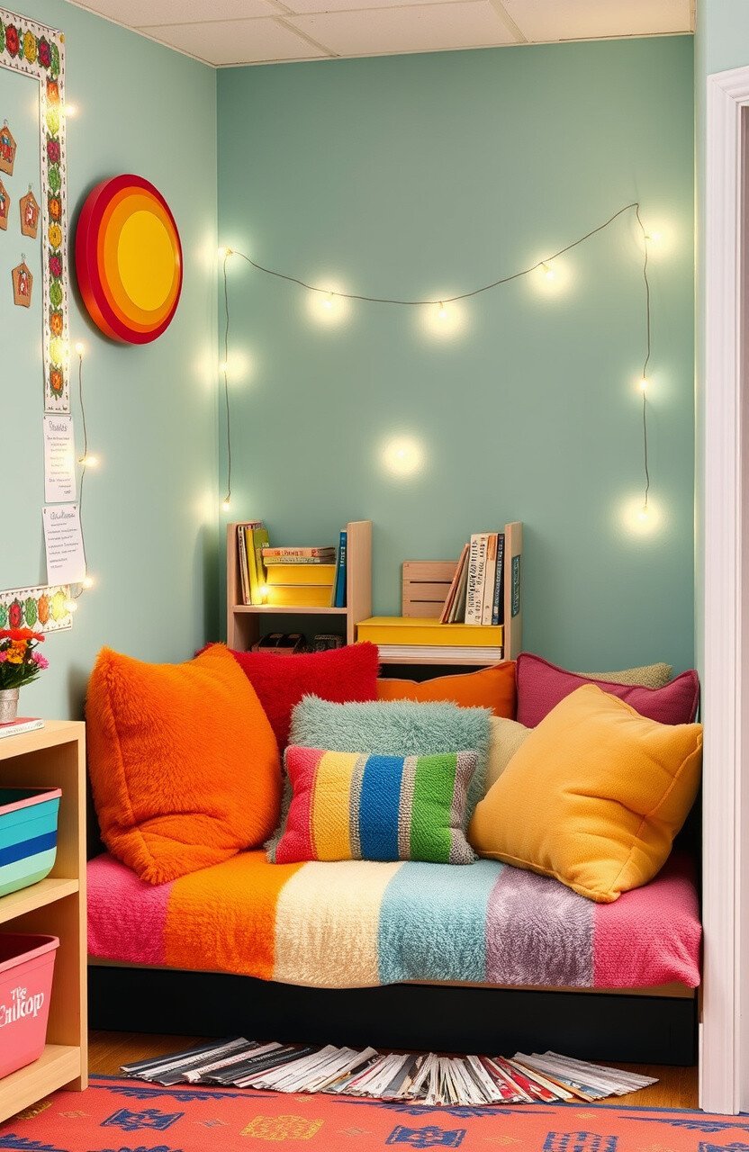 Transform a corner of the classroom into a cozy reading nook with plush, rainbow-colored pillows. This not only adds a splash of color but also encourages kids to dive into their favorite books. Mixing various textures and sizes of pillows makes the nook even more inviting.