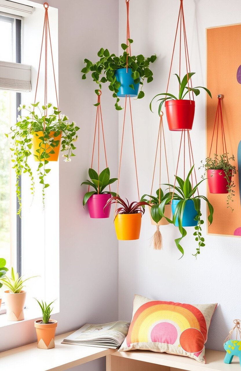 Bring a touch of nature into your reading corner with hanging plants. Choose pots in rainbow colors or opt for plants with colorful foliage. Hang them at varying heights for a dynamic, layered look.