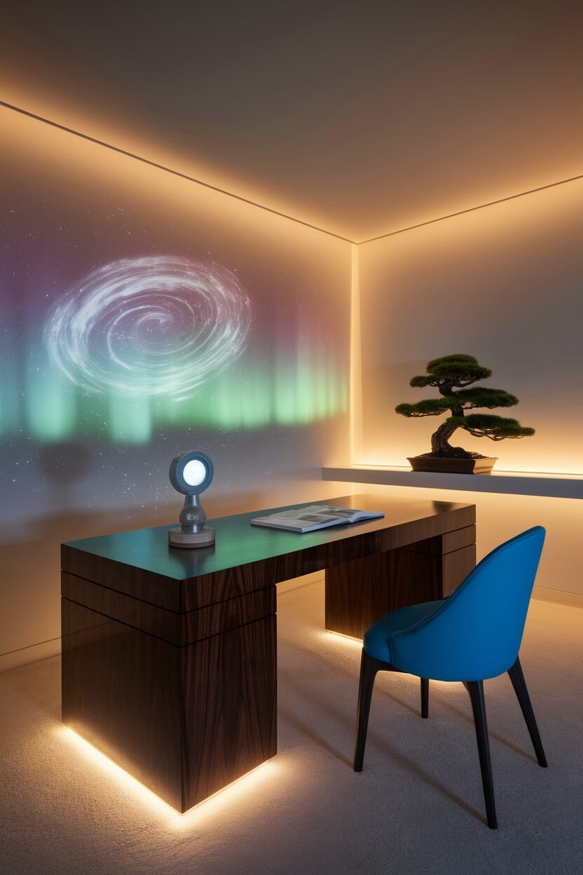 Incorporate smart lighting and sleek furniture. Use metallic colors and LED accents.