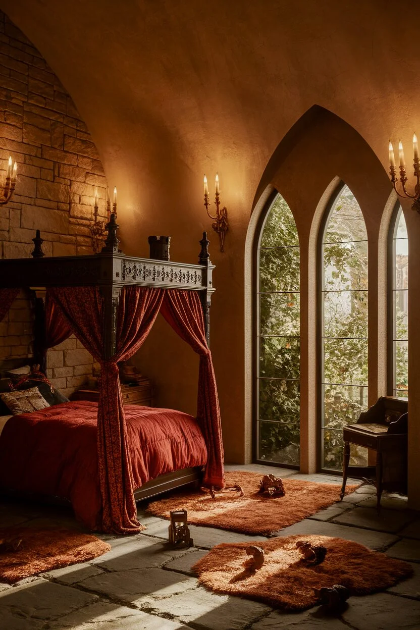 Use stone-patterned wallpaper and medieval decor. Add a canopy bed that resembles a castle tower.