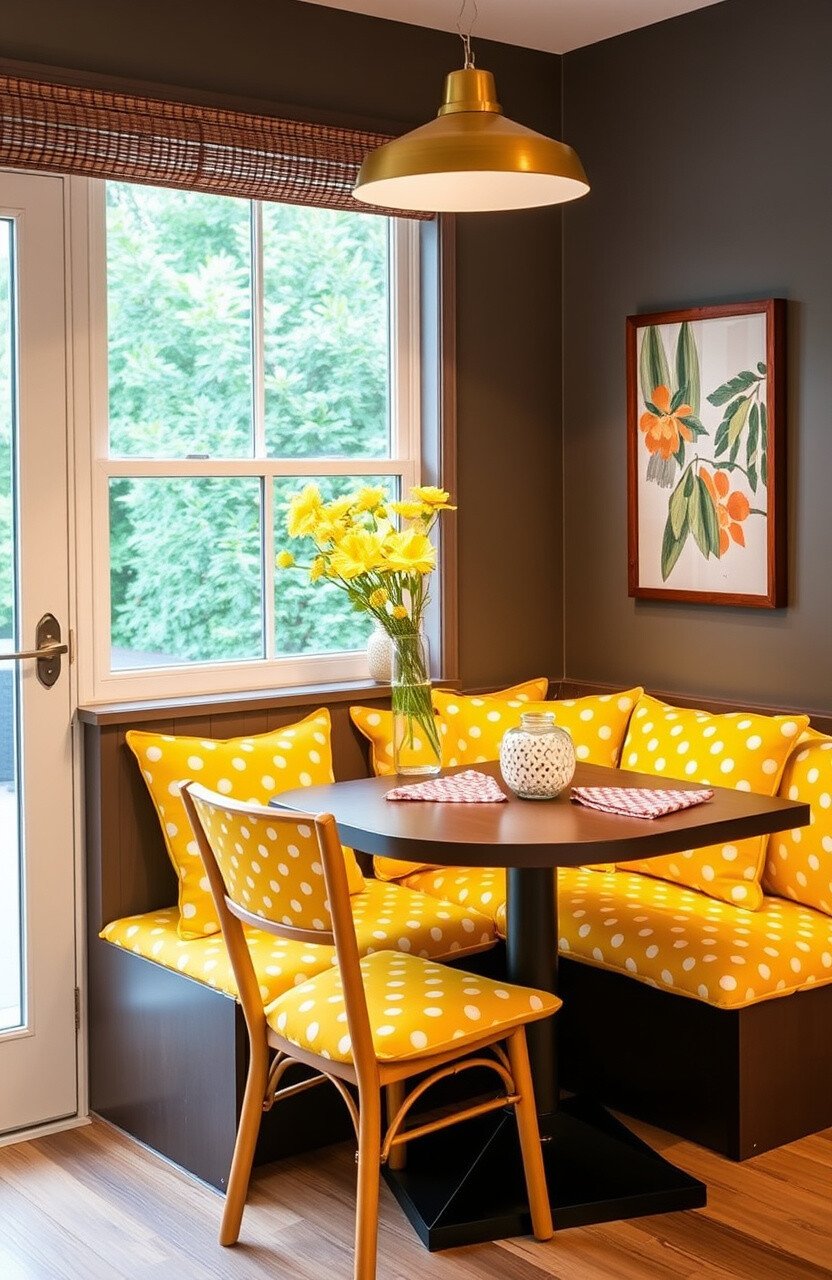 Yellow polka dot cushions bring a sense of fun and whimsy to your breakfast nook. They are perfect for adding a playful touch to your decor.