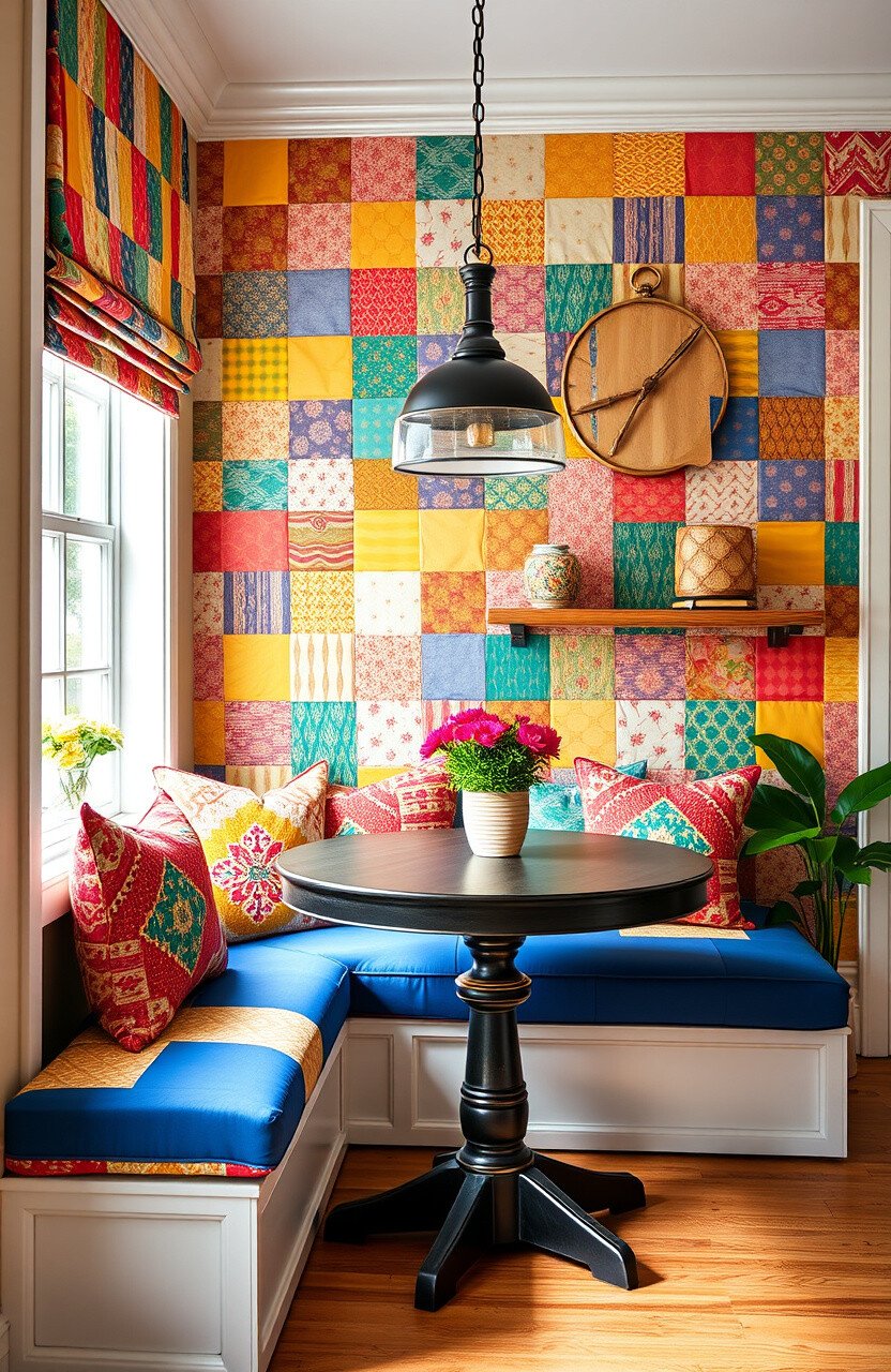 Patchwork cushions bring a colorful, eclectic touch to your breakfast nook. They are perfect for creating a vibrant, artistic space.