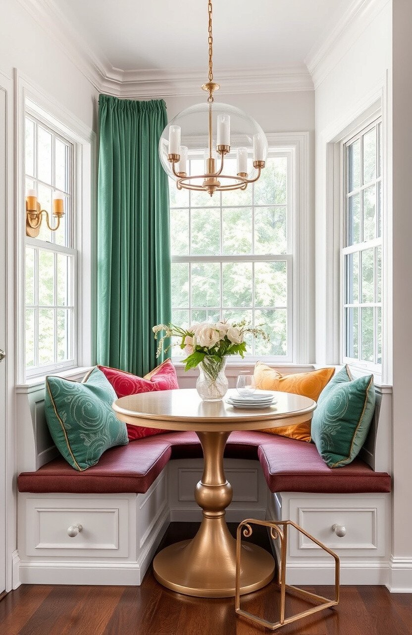 Emerald green cushions bring a touch of elegance and sophistication to your breakfast nook. They are perfect for creating a chic, stylish space.