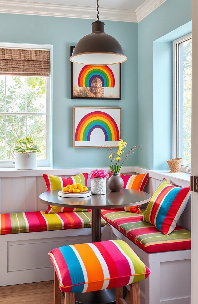 Rainbow striped cushions bring a burst of color and happiness to your breakfast nook. They are perfect for creating a vibrant, lively space.