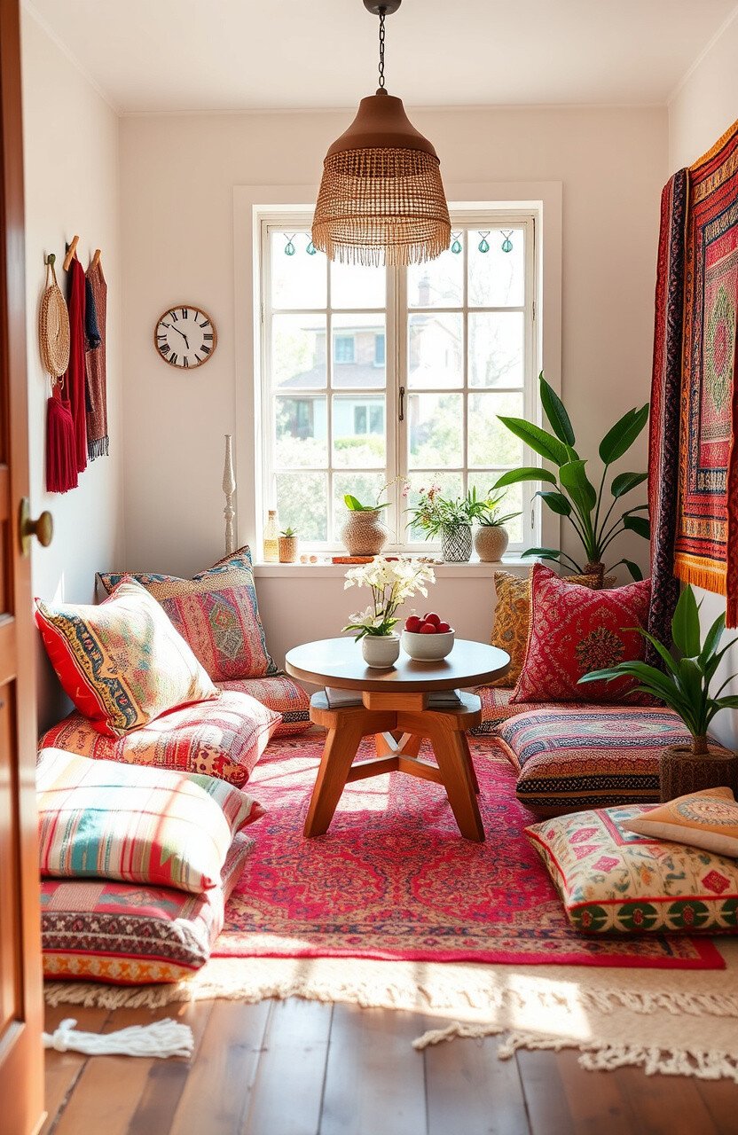 Embrace the bohemian vibe with a mix of patterns and textures. Use floor cushions and a low table for a relaxed feel.
