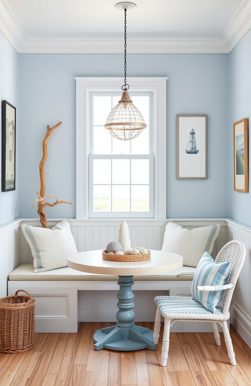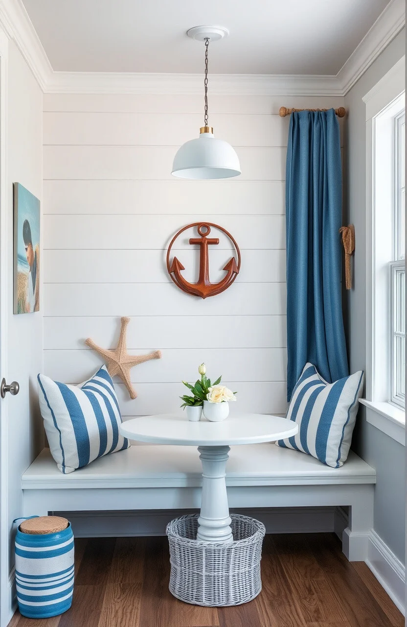 Imagine a nook with soft blues and whites, reminiscent of the sea. This idea brings a tranquil, beachy feel to your home.