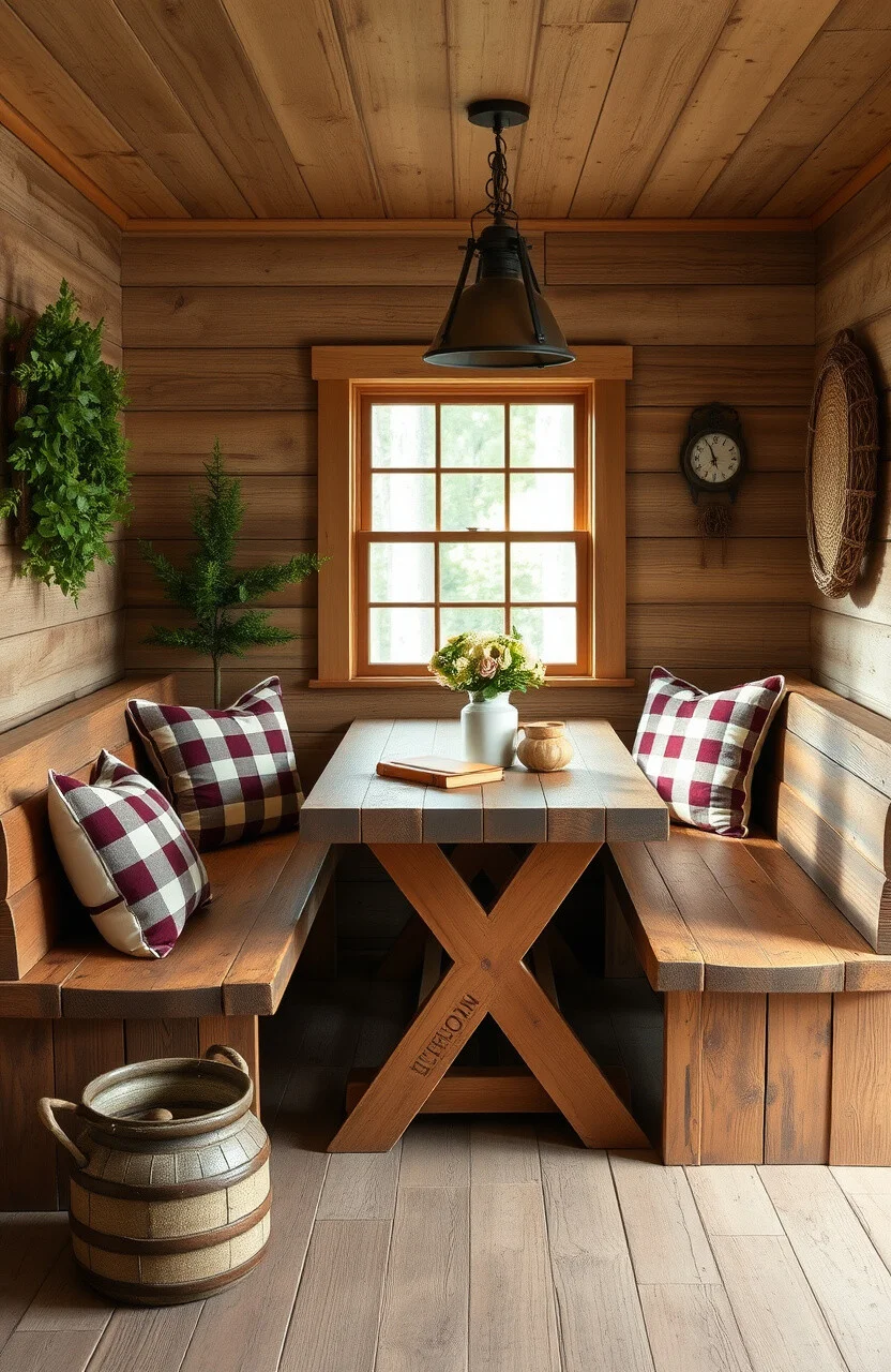 Think of a nook with wooden benches and a sturdy table, giving a cabin-like feel. This setting promises warmth and a touch of nature.
