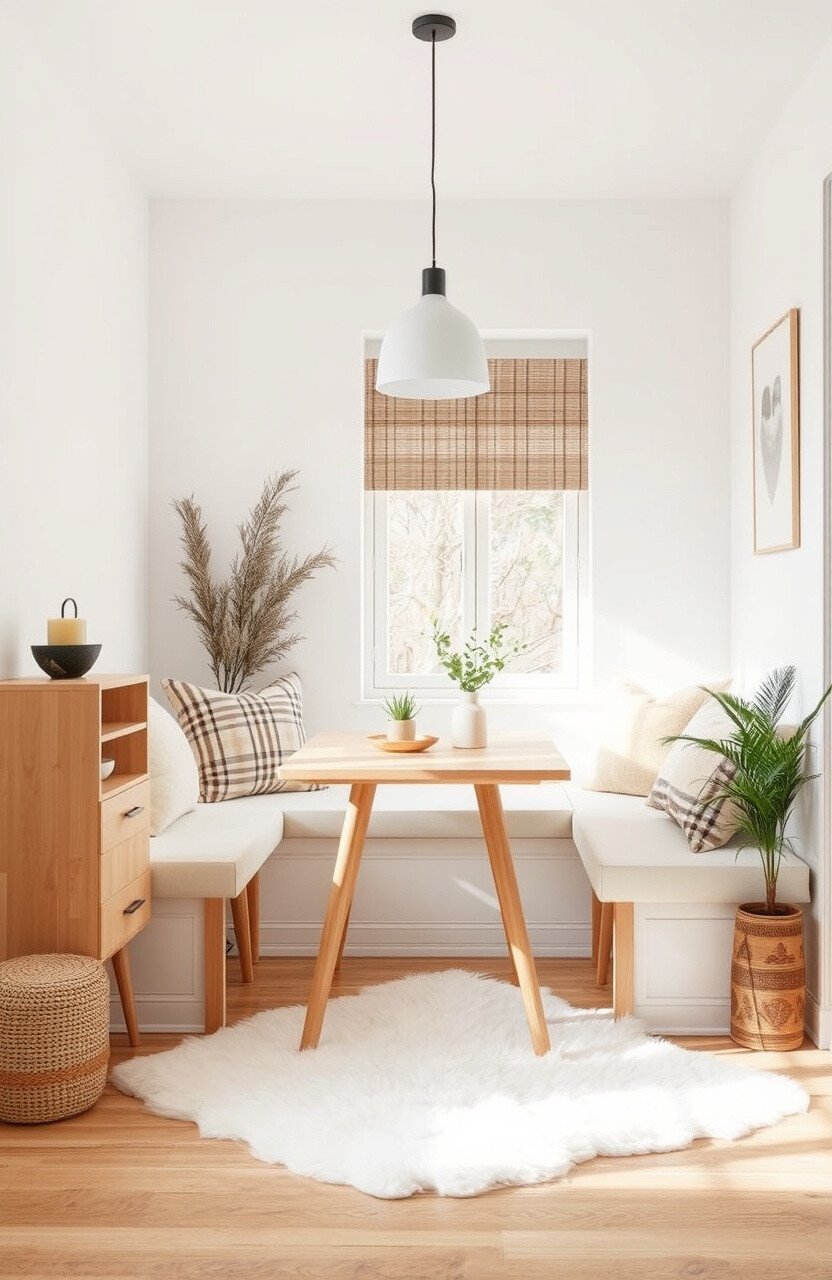 A nook with light wood furniture and neutral tones offers simplicity. This style is all about comfort and functionality.