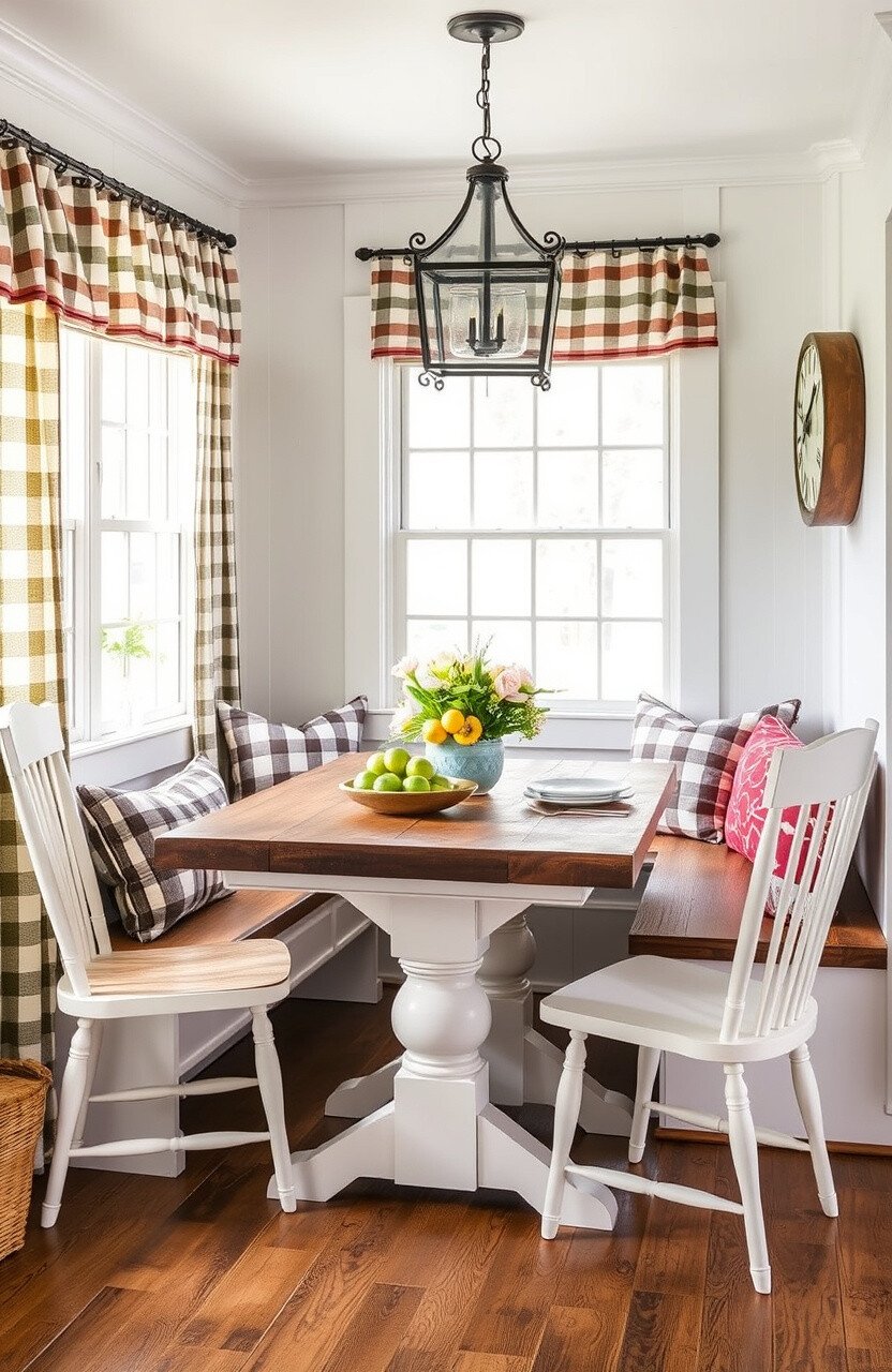 Think of a nook with a wooden table and floral fabrics. This idea brings the charm of a countryside cottage to your home.