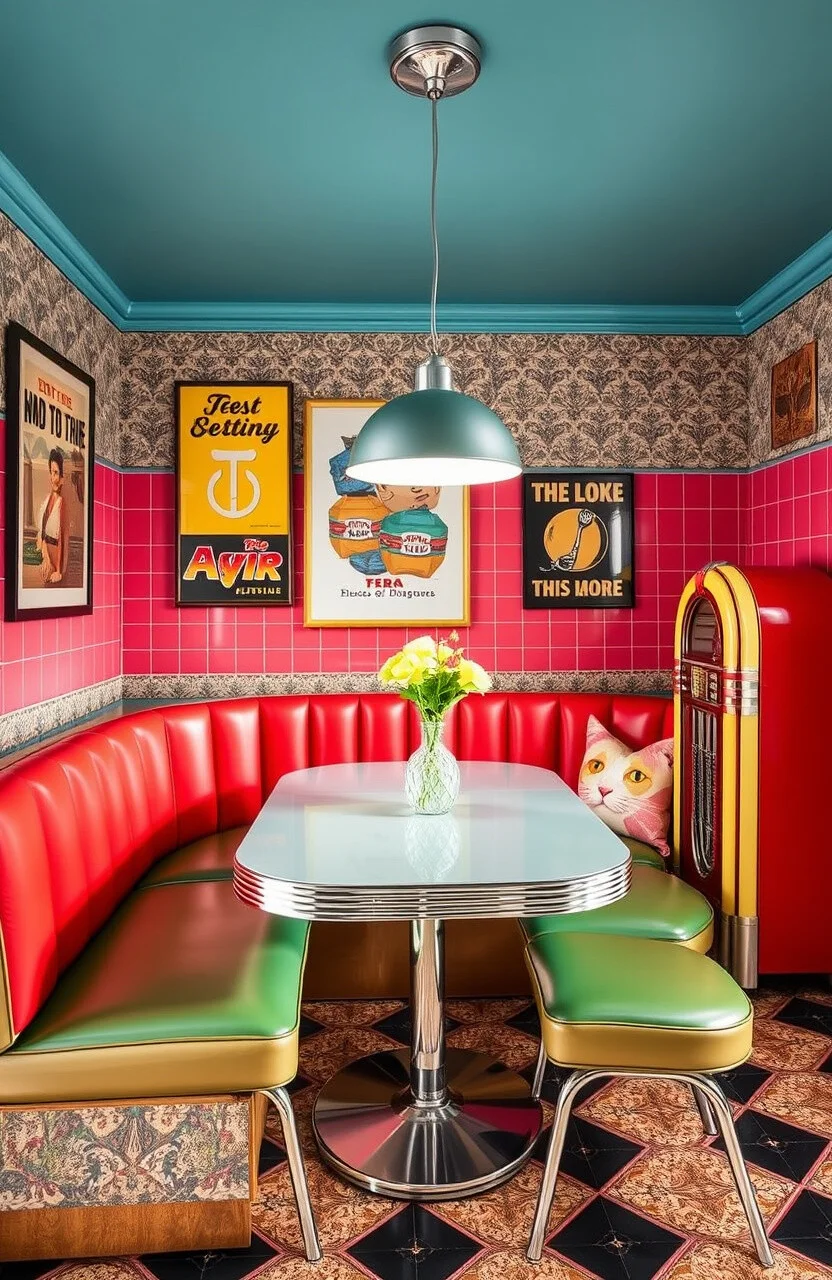 Step back in time with a nook featuring vintage patterns and bold colors. This idea brings a playful and nostalgic vibe.
