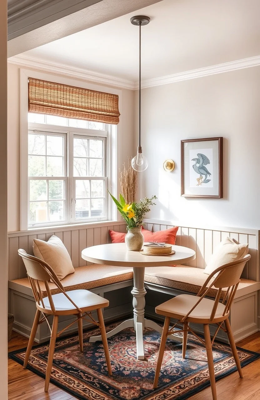 This idea creates a cozy spot right next to a big window. The benefit is having natural light pour in as you enjoy your breakfast.