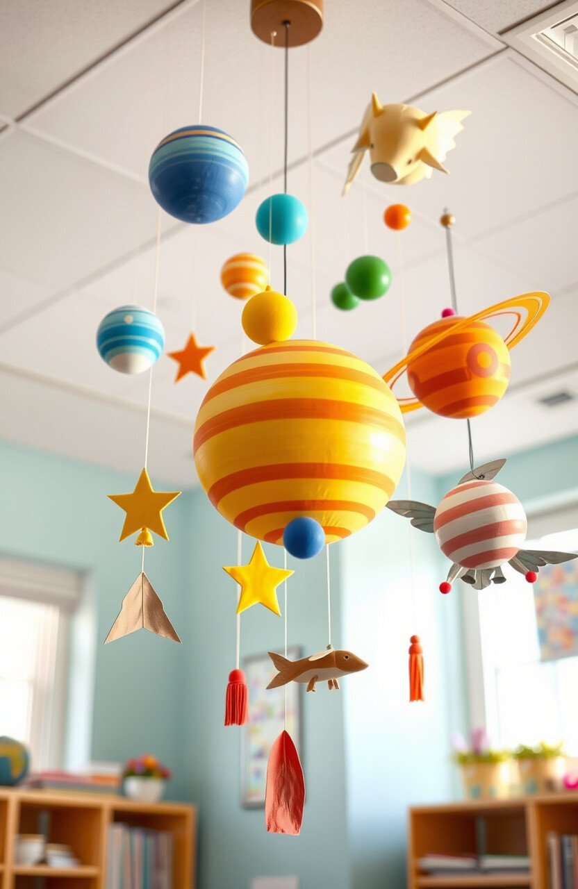 Use bright colors and lightweight materials for safety. Involve students in creating mobiles for a personal touch.