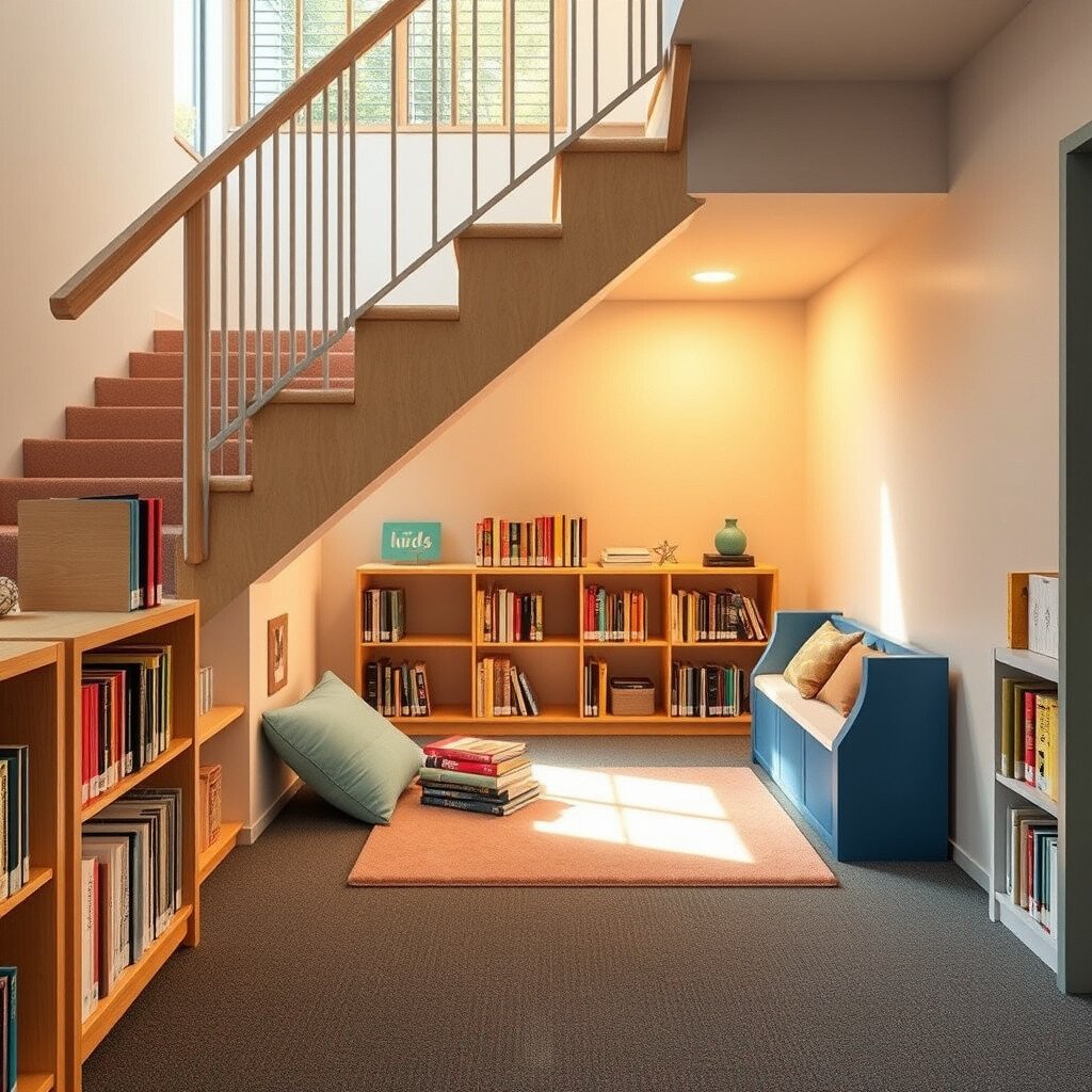 If you have stairs, utilize the space underneath for a small reading nook. Add a soft mat and some pillows to create a cozy hideaway.