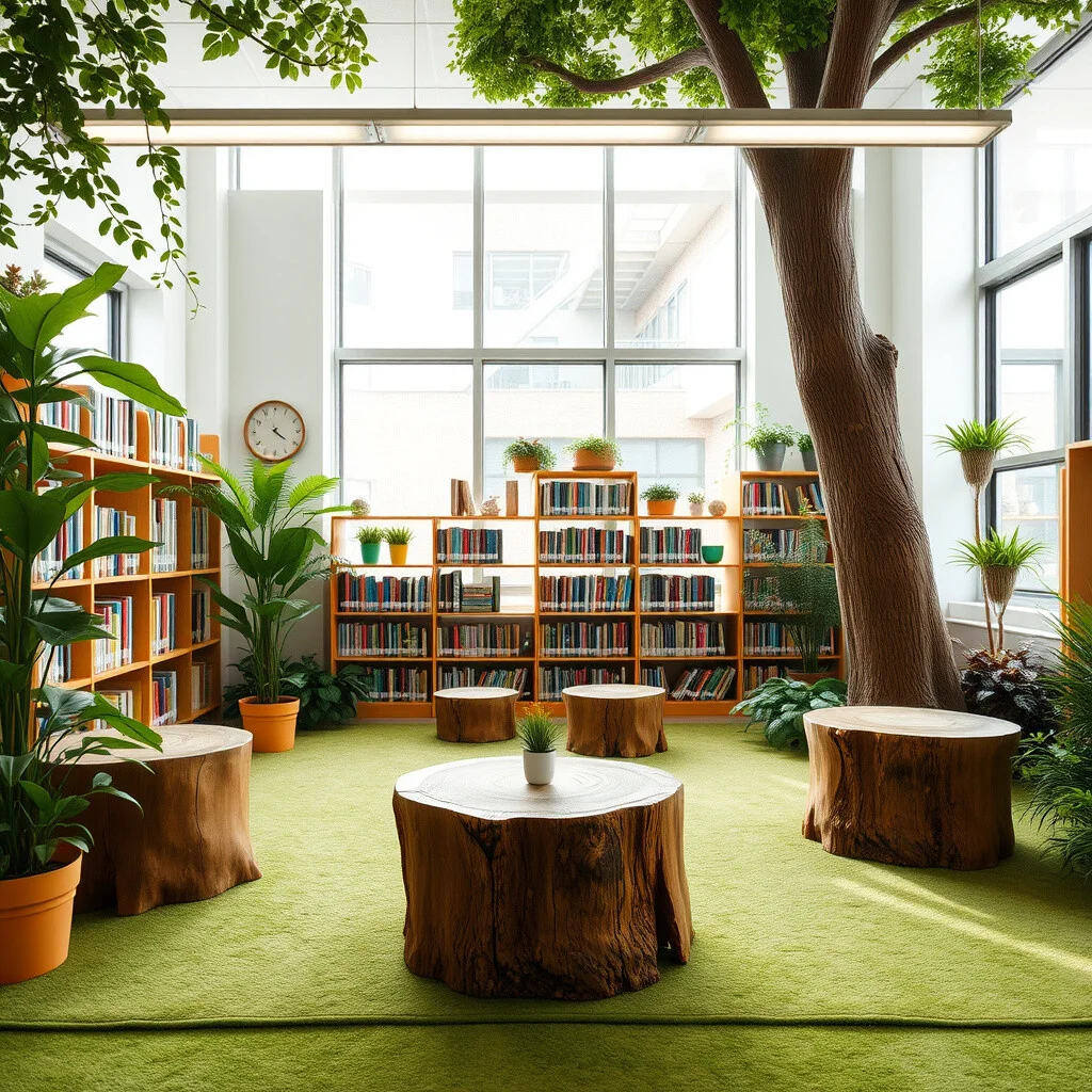 Create a forest-themed reading area with green rugs, artificial plants, and tree stump stools. This nature-inspired nook feels like a storybook come to life.