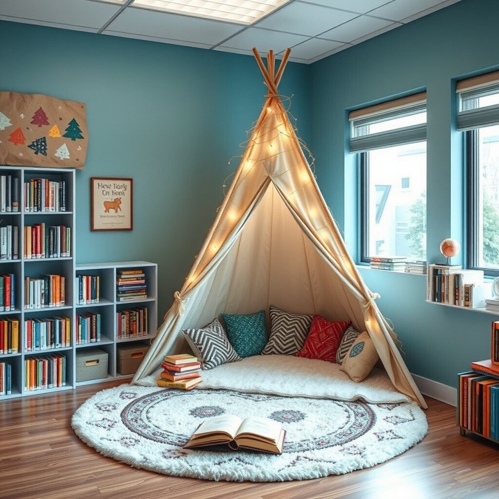 Set up a small teepee in a corner of the library. Fill it with plush rugs and fairy lights to create a magical hideaway.