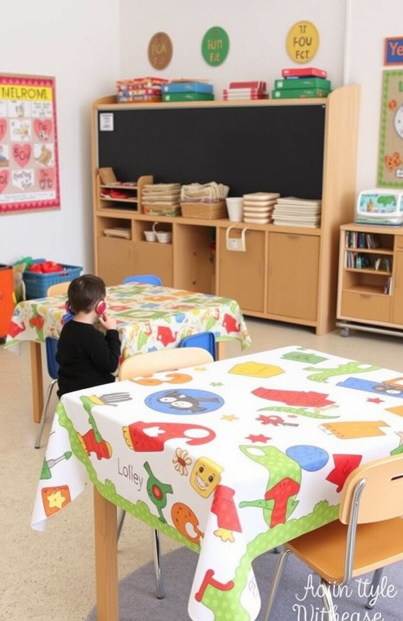 Tablecloths can change with seasons or lessons, keeping the classroom fresh and engaging.