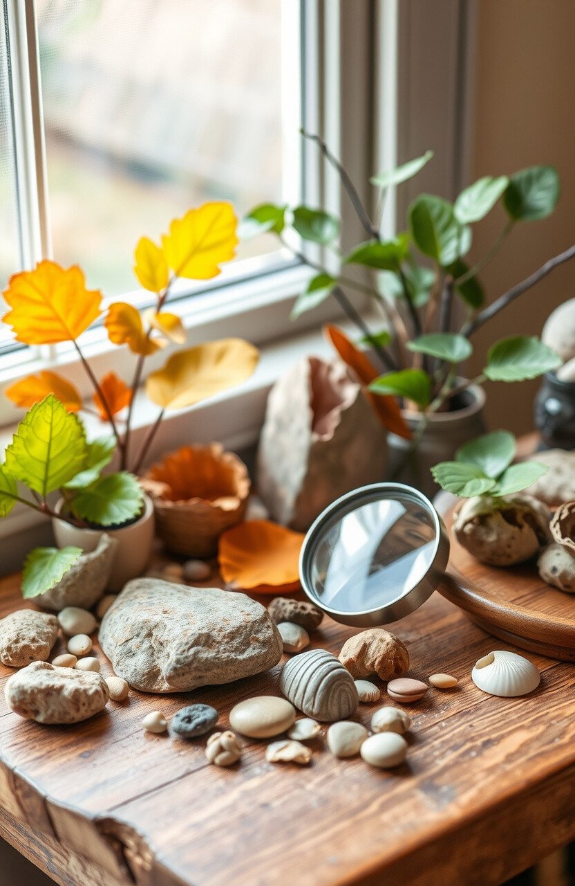 Create a nature table where kids can display found treasures like rocks, leaves, and shells. It brings a bit of the outdoors inside.