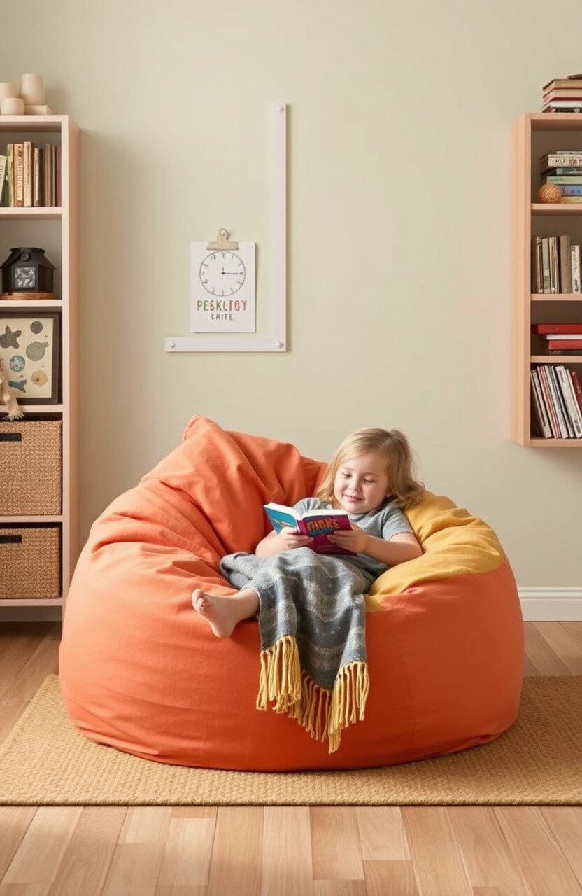 A bean bag chair offers a comfy spot for reading or relaxing. It’s a simple way to add extra seating to a homeschool room.