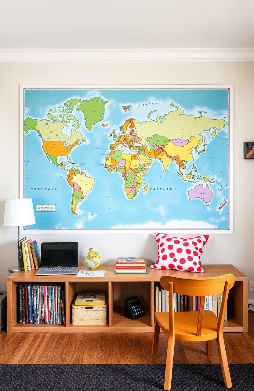 Cover a wall with a world map to spark curiosity about geography. It’s an educational and decorative feature.