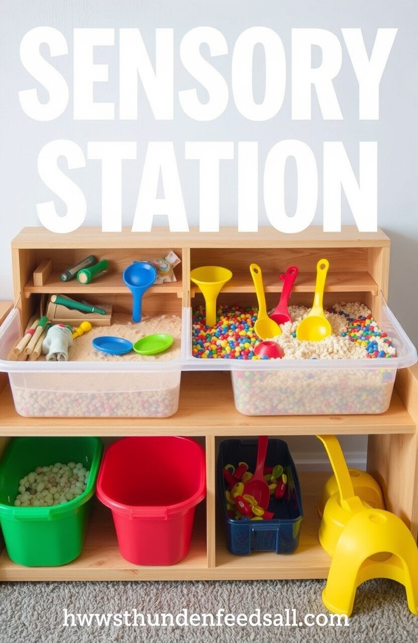 A sensory station provides tactile and sensory experiences. It’s great for hands-on learning and calming activities.