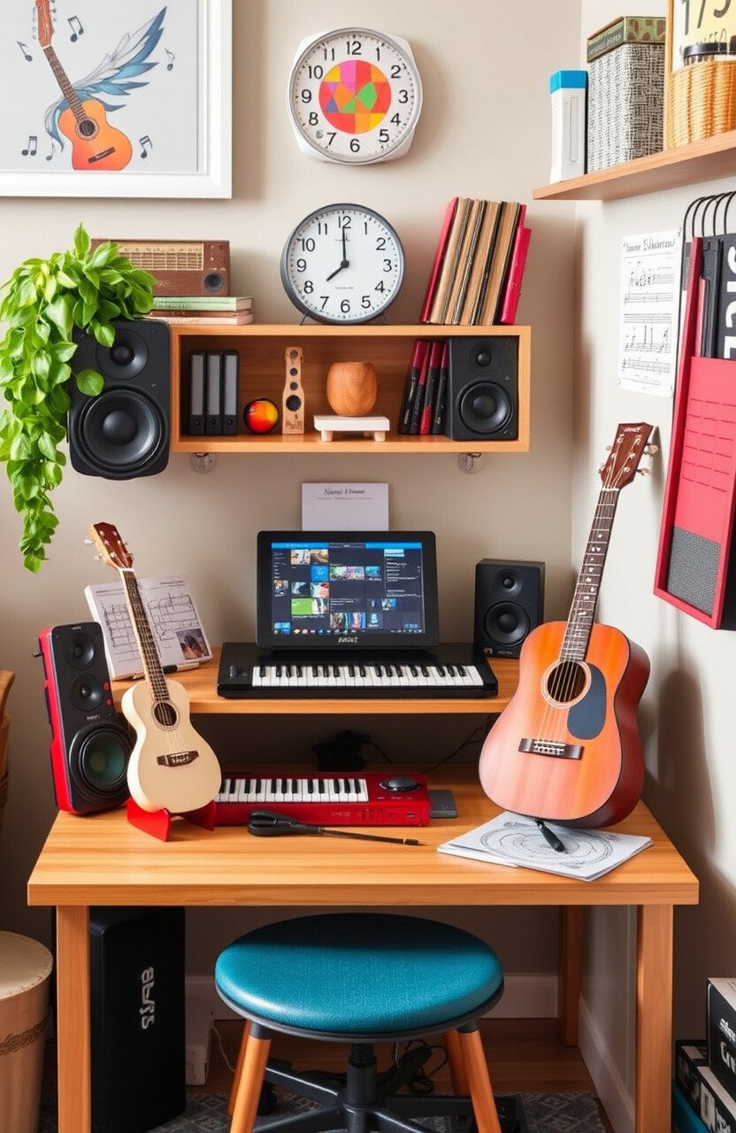Include simple instruments like a keyboard or ukulele. Use apps or online resources for lessons.
