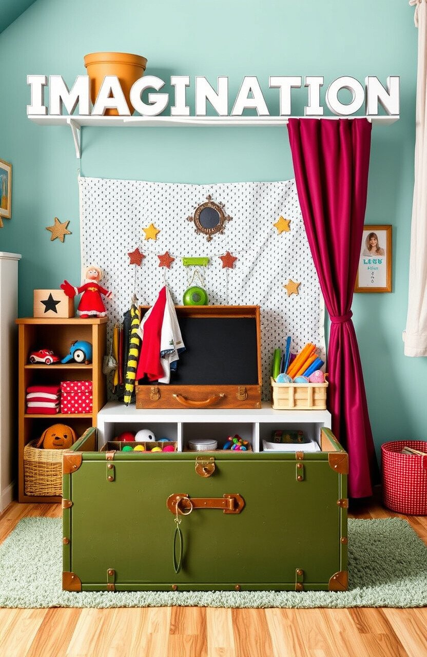 Use a small trunk or bin to store costumes and props. Rotate items to keep playtime exciting.