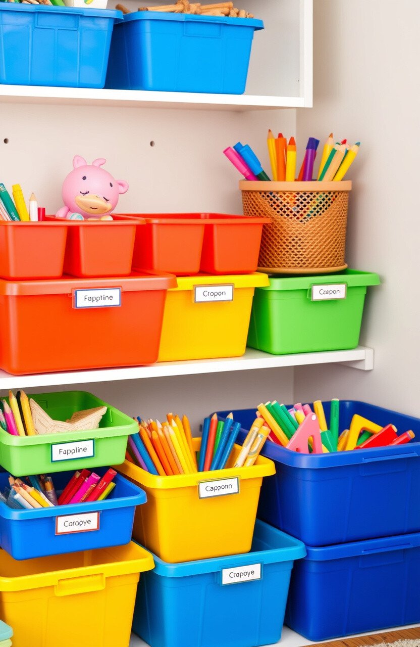 Bright storage bins and baskets add a splash of color while keeping supplies organized. It’s both functional and fun.