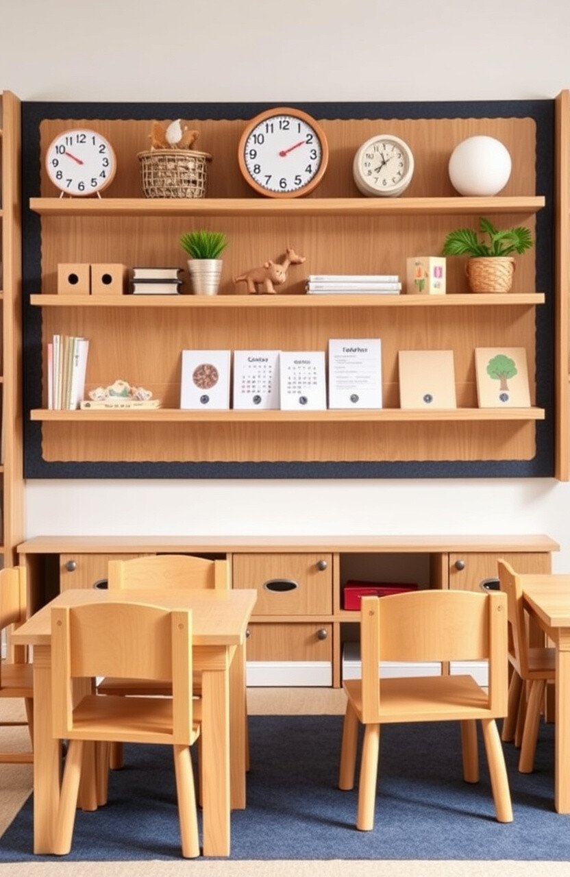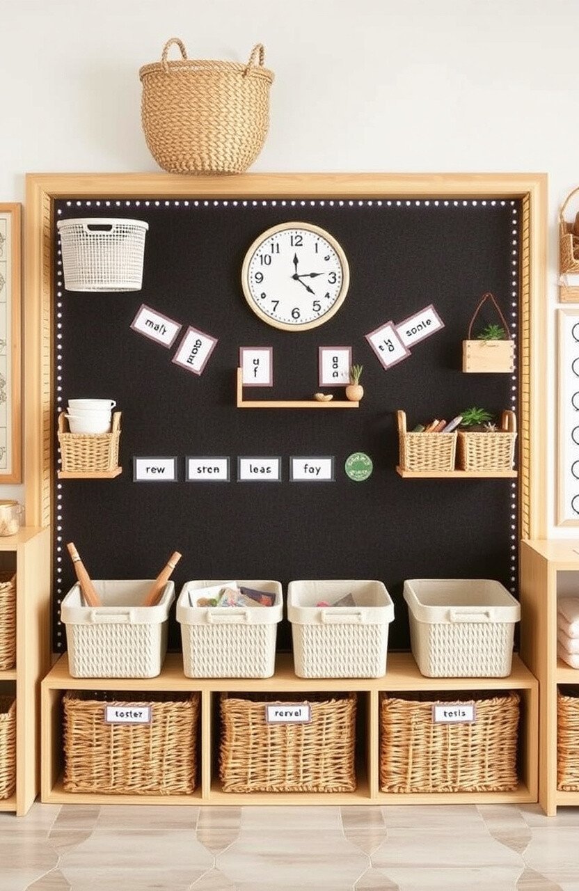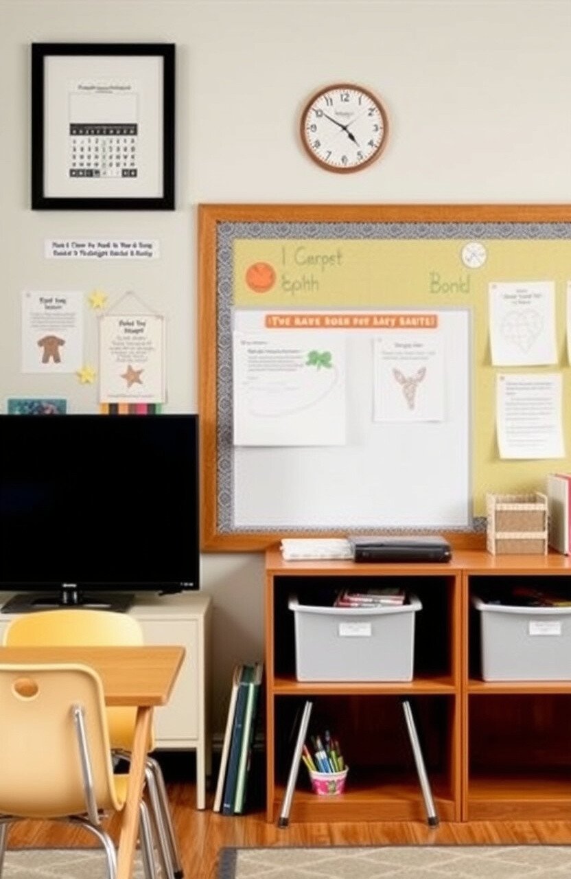 Think outside the box with storage ideas, like repurposing items you already have. It’s a budget-friendly way to keep the classroom tidy and serene.