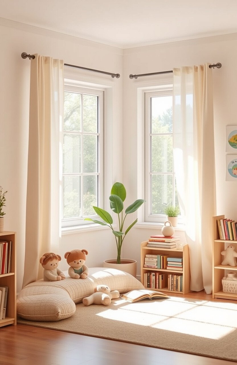 Neutral-colored curtains can help define the reading space and add a touch of elegance. They provide a backdrop that enhances the calm, cozy feel of the corner. Choose materials that let in natural light while maintaining privacy.