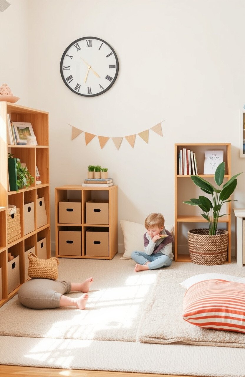 Area rugs in neutral tones can define the reading space and add warmth. Choose patterns like stripes or simple geometric designs to maintain a subtle look. The softness underfoot invites children to sit and read comfortably.