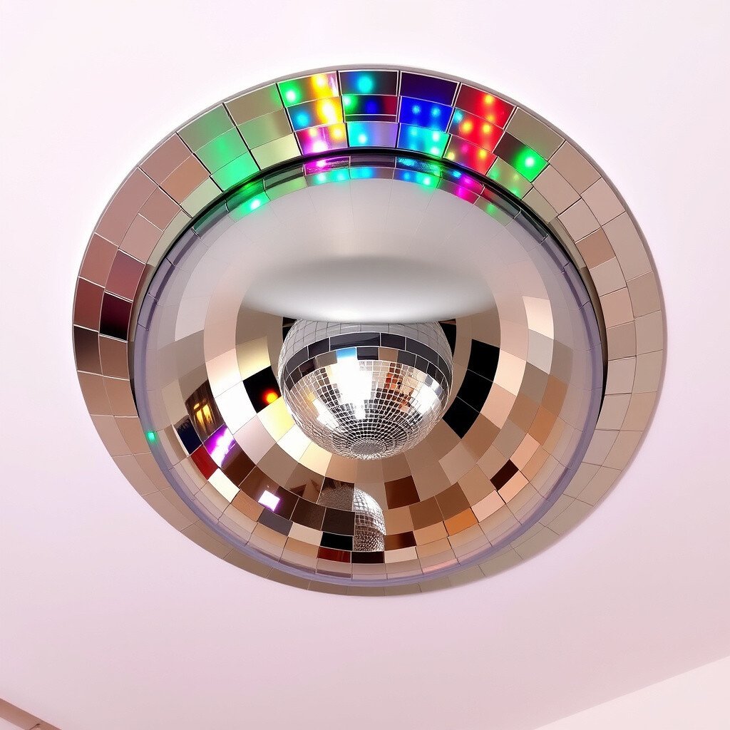 Bring the disco era into your home with a ceiling mirror that reflects colorful lights. This setup is ideal for a living room or entertainment area, turning any gathering into a dance party.