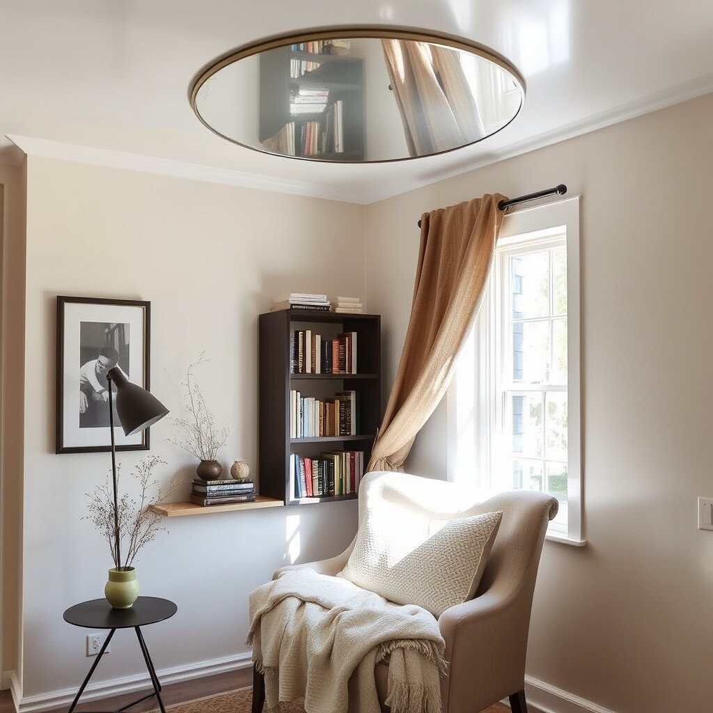 Enhance a reading nook with a ceiling mirror that reflects natural light. This idea is perfect for creating a warm, inviting space to relax with a good book.