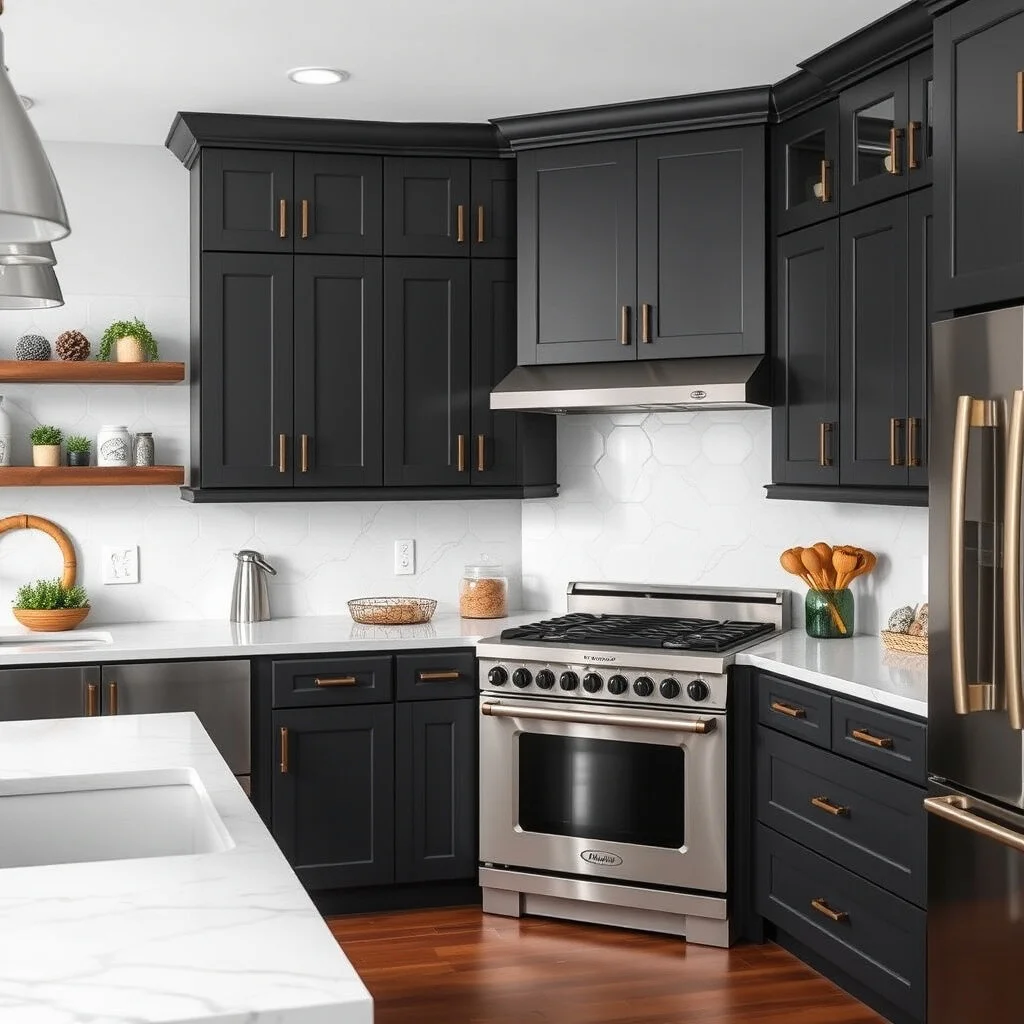 Accessorize with brass or copper handles for a touch of warmth and luxury. The dark cabinets beautifully contrast with white or marble countertops, creating an inviting space that’s both functional and stylish.