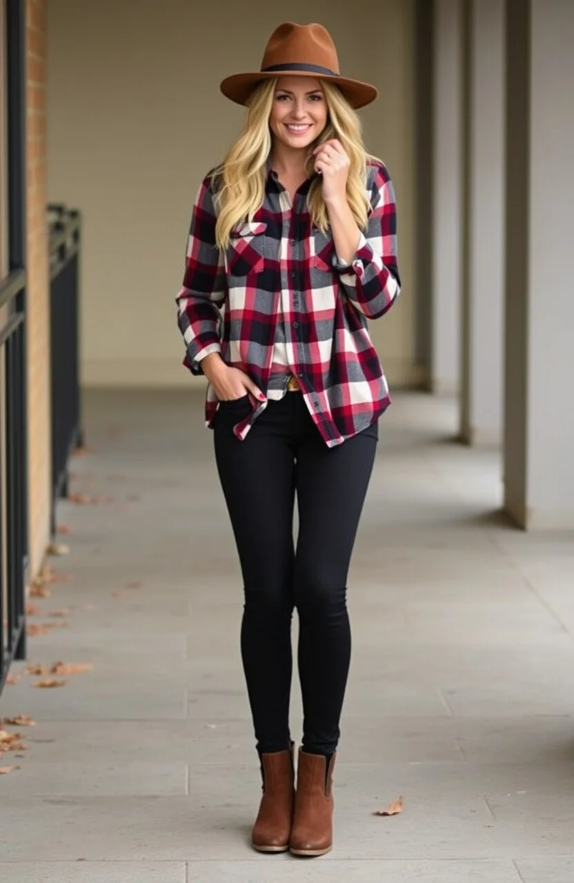 Choose a flannel in colors that suit your style and pair with neutral leggings for balance. This look is easy to put together and can be dressed up with accessories like hats or chunky boots. Flannel shirts are widely available and budget-friendly, making this an easy go-to outfit.