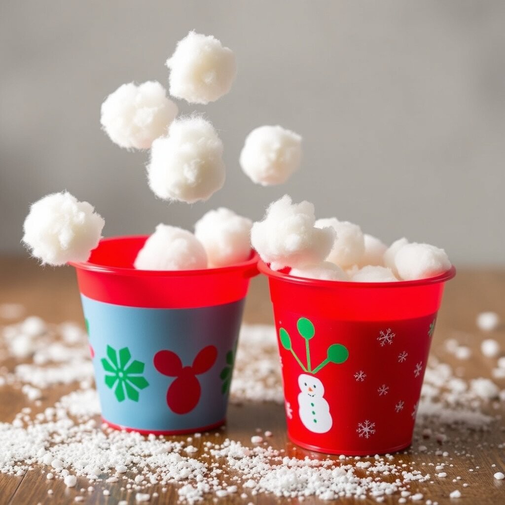 Soft, fluffy cotton balls become snowballs in this easy game. Toss them into festive buckets to win points, bringing a snowy delight indoors.