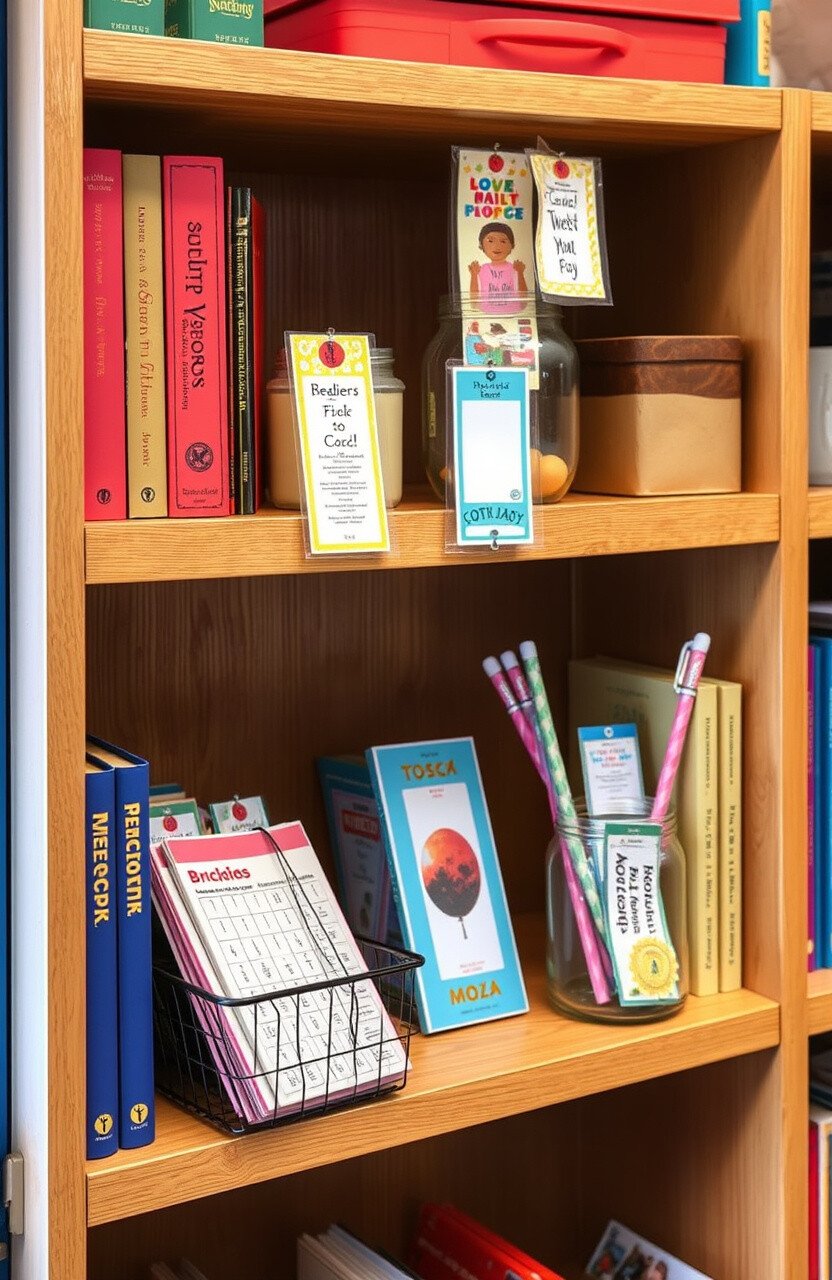 Decorate shelves with inspirational quotes to motivate students. This adds positivity to the classroom environment.