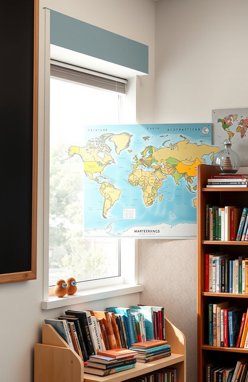 Incorporate a world map near the bookshelf to inspire wanderlust. This encourages curiosity about geography and cultures.