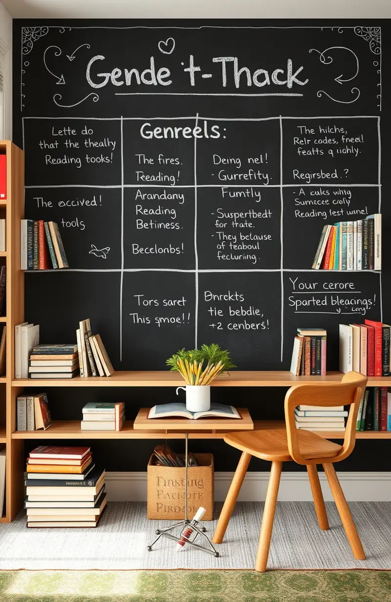 Create sections on your chalkboard wall dedicated to different genres. This adds structure and organization to your reading nook.