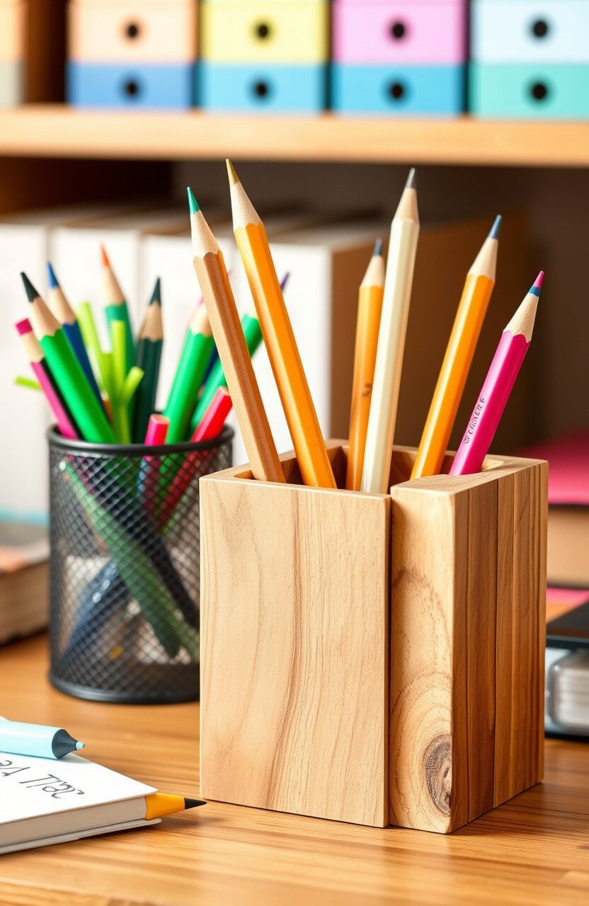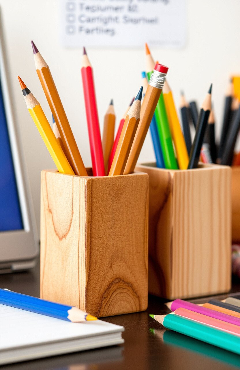 Wooden pencil holders keep desks tidy. They are charming and rustic. These holders add a natural touch to workspaces. They are perfect for organizing pencils and pens.