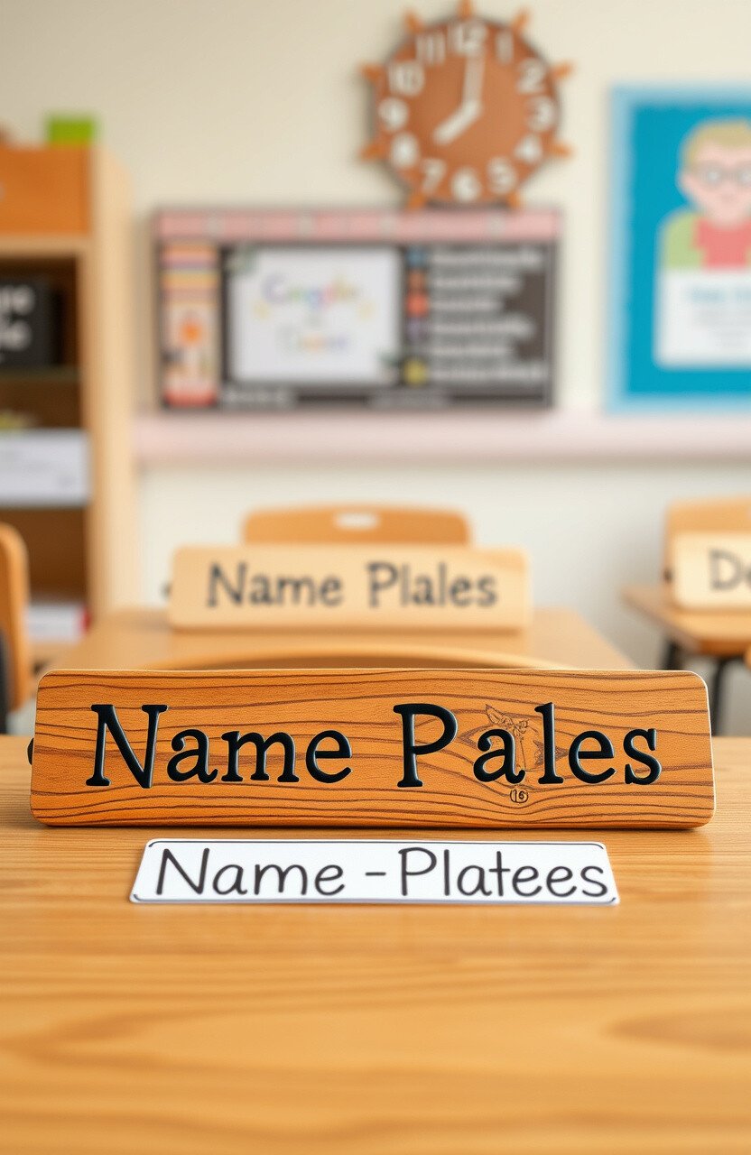 Wooden name plates add a personal touch to desks. They are charming and rustic. These plates help students feel ownership of their space. They add warmth to the classroom environment.