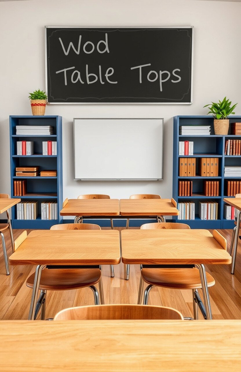 Wooden table tops bring a natural element to desks. They are smooth and easy to clean. These tops are sturdy and durable. They add a rustic charm to the classroom.