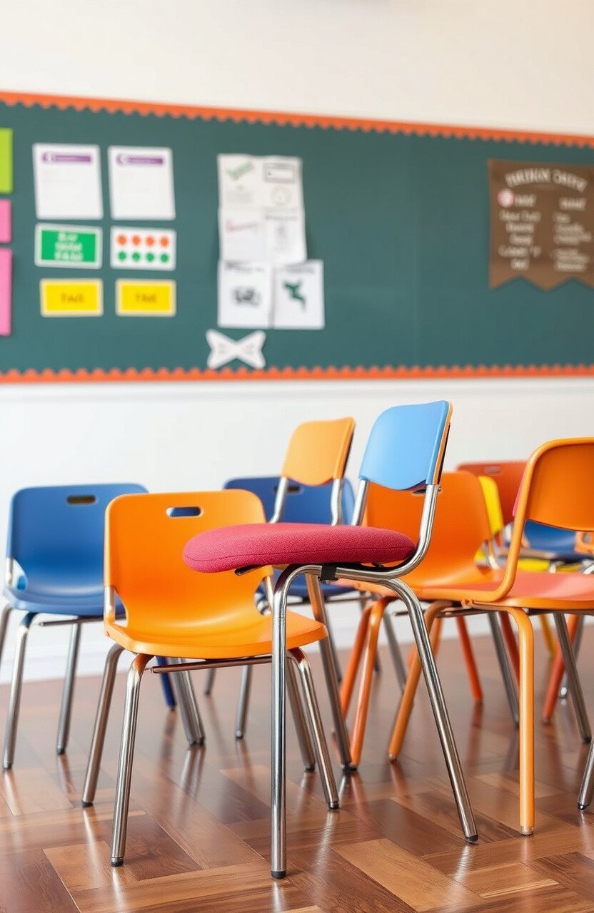 Add colorful cushions for extra comfort. Personalize them with cushion covers that match your classroom theme. Metal chairs are affordable and often come in sets. They’re perfect for creating a trendy, organized look.