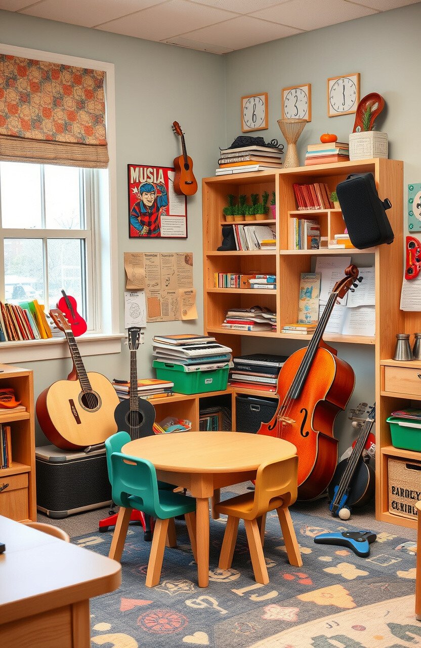 Second-hand instruments or DIY percussion tools make this corner budget-friendly. Enjoy a classroom alive with the sound of music!