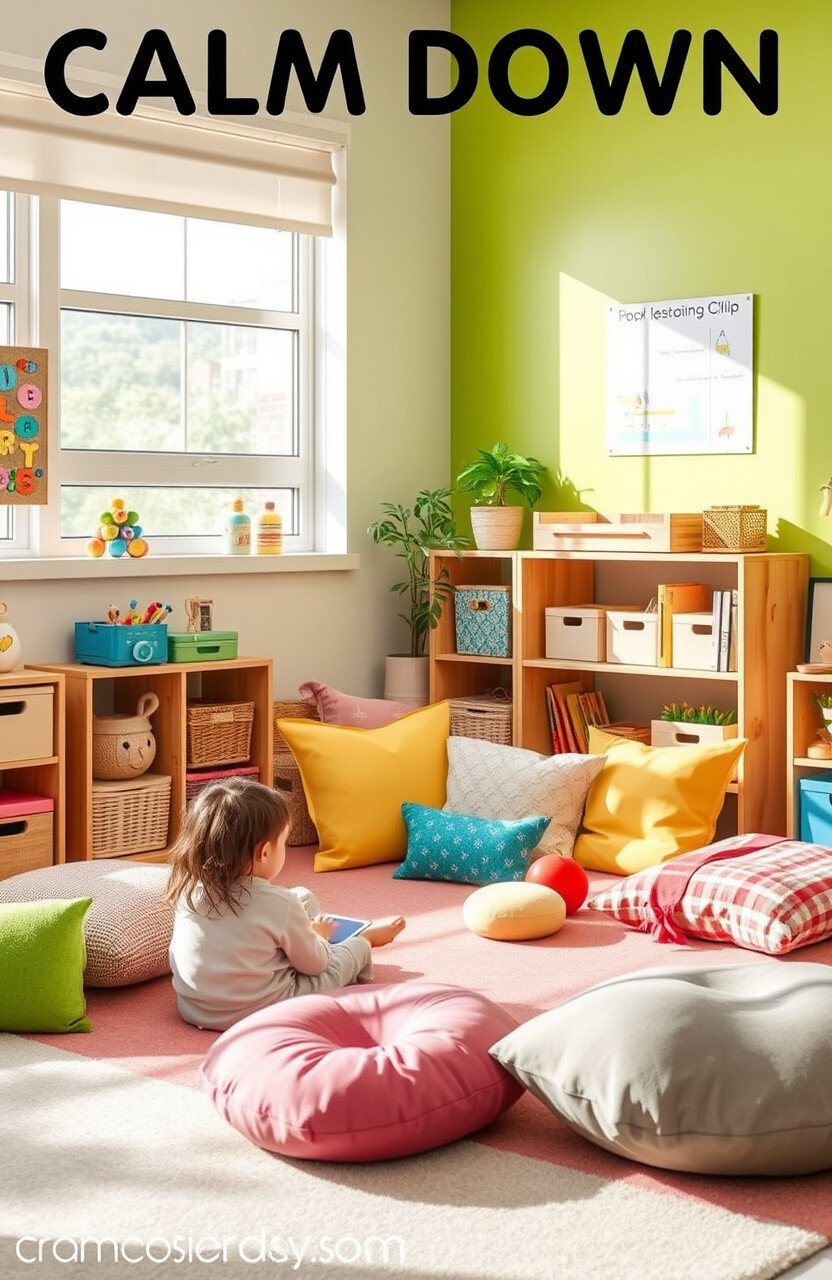 A calm down zone can be a peaceful retreat for students needing a moment of quiet. Include soft cushions, sensory toys, and soothing colors.