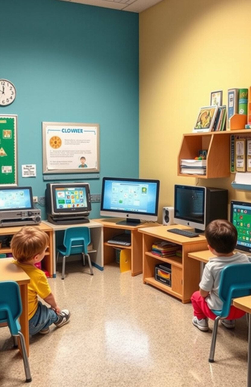 Introducing technology in the classroom can enhance learning. A dedicated tech corner keeps devices organized and accessible.