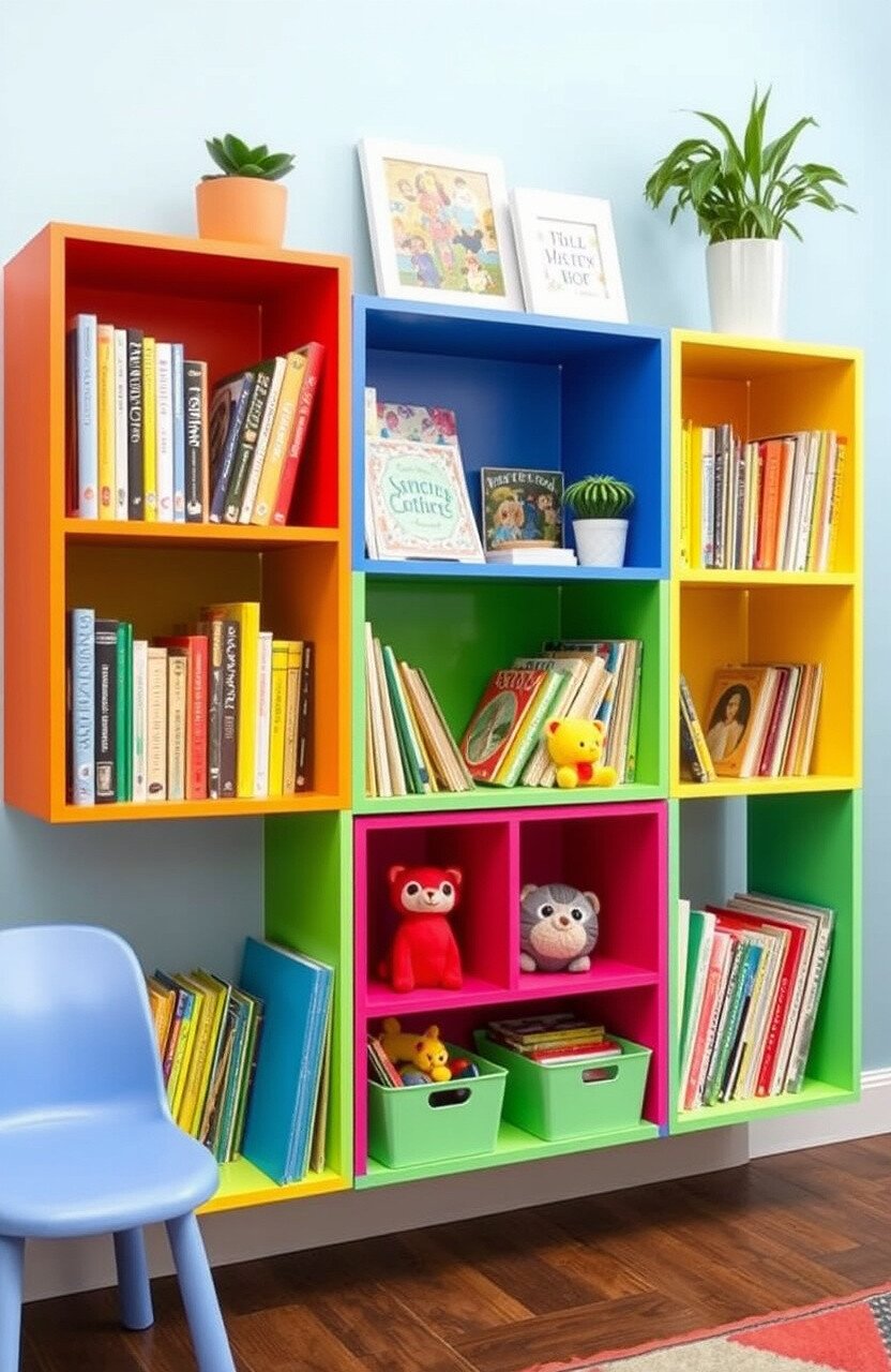 Colorful bookshelves are a fantastic way to bring brightness into any room. They are more than just storage; they become an artistic focal point.